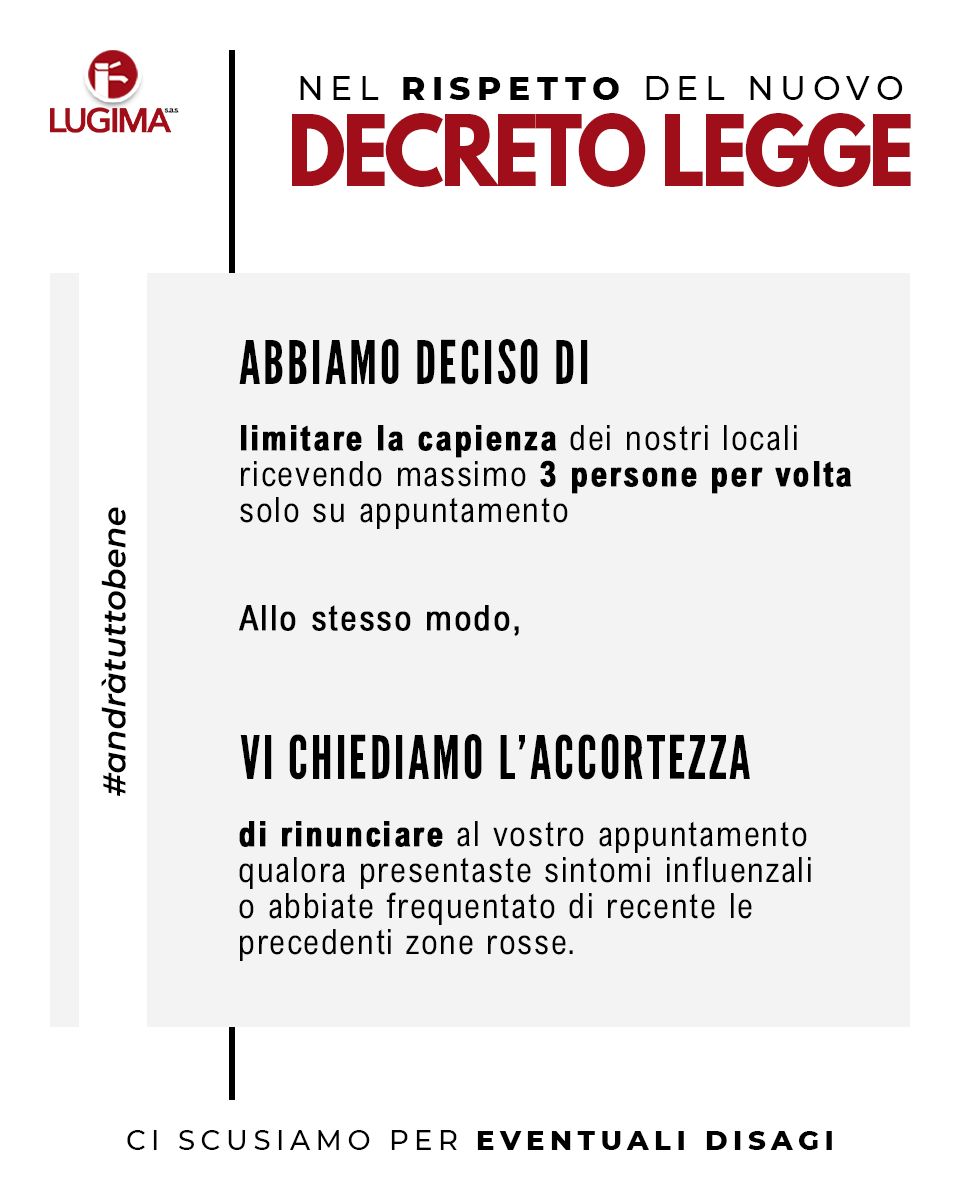 Leggi altroNel rispetto del nuovo decreto legge, per evitare assembramenti di persone e rispettare la distanza di sicurezza consigliata abbiamo deciso di:👉 limitare la capienza dei nostri locali ricevendo massimo #TRE persone per volta, solo su appuntamento...